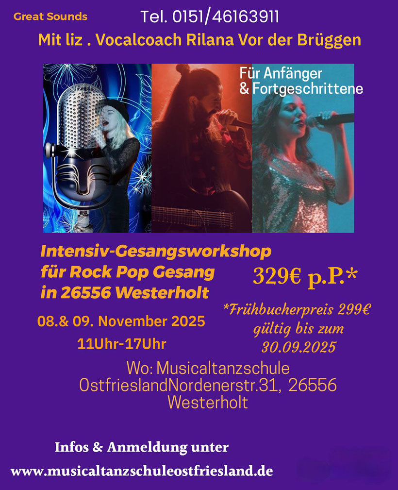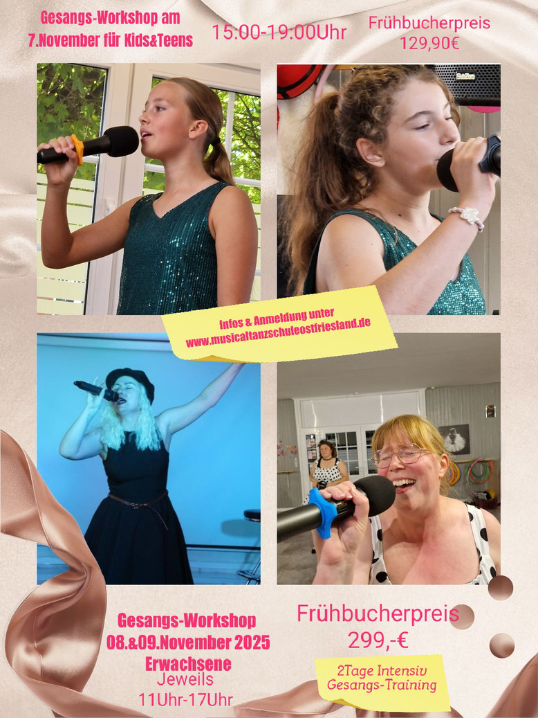 Zwei Tage arbeiten wir intensiv an Gesangstechniken, Bühnen-Perfomance, Bühnenpräsenz/Ausstrahlung, Atemtechnik u.v.m. Weitere Inhalte sind neben den sängerischen Grundlagen, wie Einsatz der Resonanzräume, Einsatz von Bruststimme, Mischstimme und Kopfstimme, der wichtigen Info "wie ich einen Song erarbeite" , interaktive Aufgaben und Spiele. Der Workshop ist geeignet für Anfänger und Fortgeschrittene! 🤗