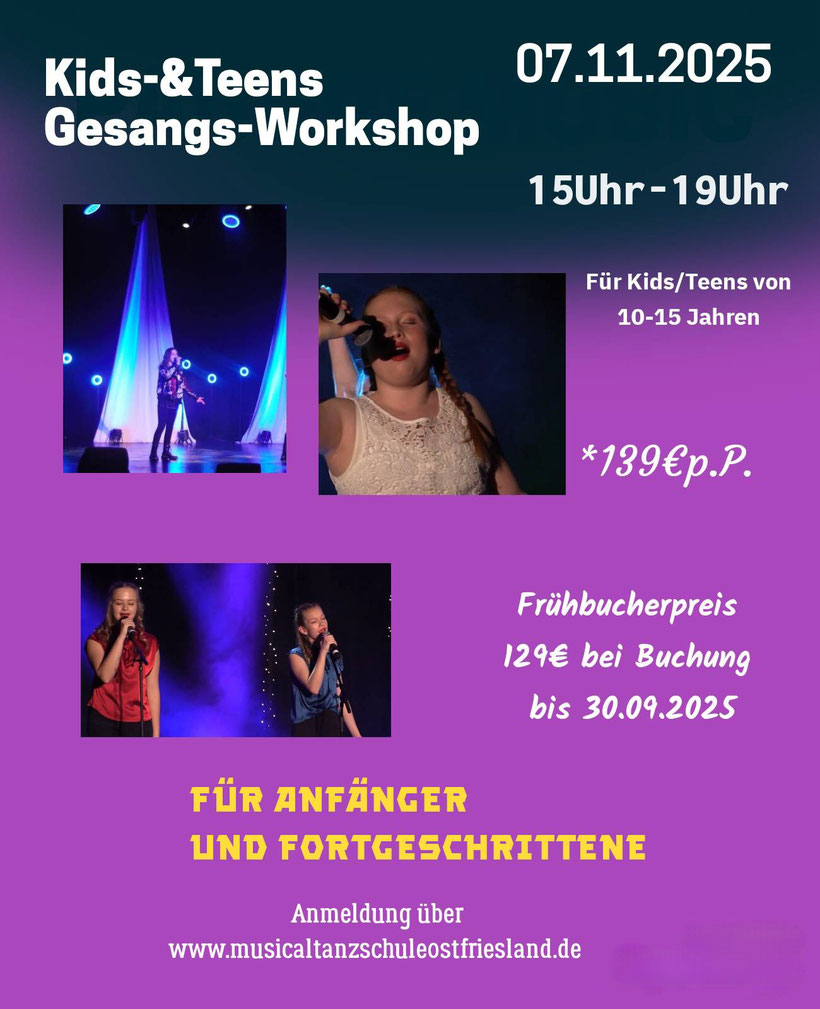 Du möchtest singen wie die Stars? Dann nix wie los! Sicher Dir deinen Platz in diesem großartigen Workshop. Rilana hat bereits vielen Kindern und Erwachsenen erfolgreich singen beigebracht. Ihre Schüler waren erfolgreich bei Musical Castings und The Voice Kids. Alle Schüler, die sich für ihre Aufnahmeprüfungen fürs Musikstudium bei Rilana vorbereitet haben, haben ihre Prüfungen sehr erfolgreich bestanden. Ihr befindet euch also in guten Händen.